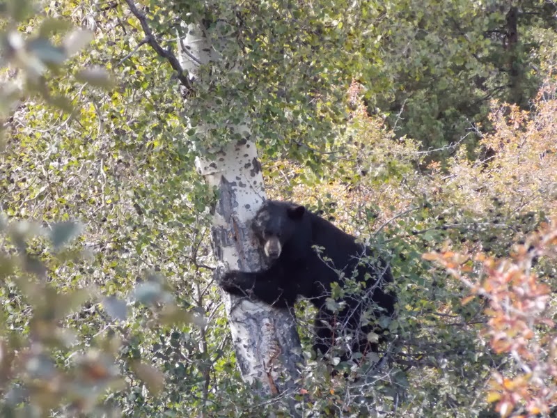 We barely blinked and there the bear was, 10 feet up a big aspen tree, leaning over to (you guessed it) eat some more berries.