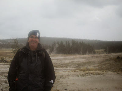 We decided that we hadn't had enough walking yet, so we walked down past the Castle Geyser to see some of the other parts of the basin. Although it was quite chilly, it was dry enough, and we were warm enough, and the walk was really quite fine.We arrived back at Old Faithful just in time for its next eruption. This time, we were a little bit farther away, and a little bit over to the side, and the entire experience was actually much better: we could see the geyser's plume much more clearly, and we didn't get soaked!
