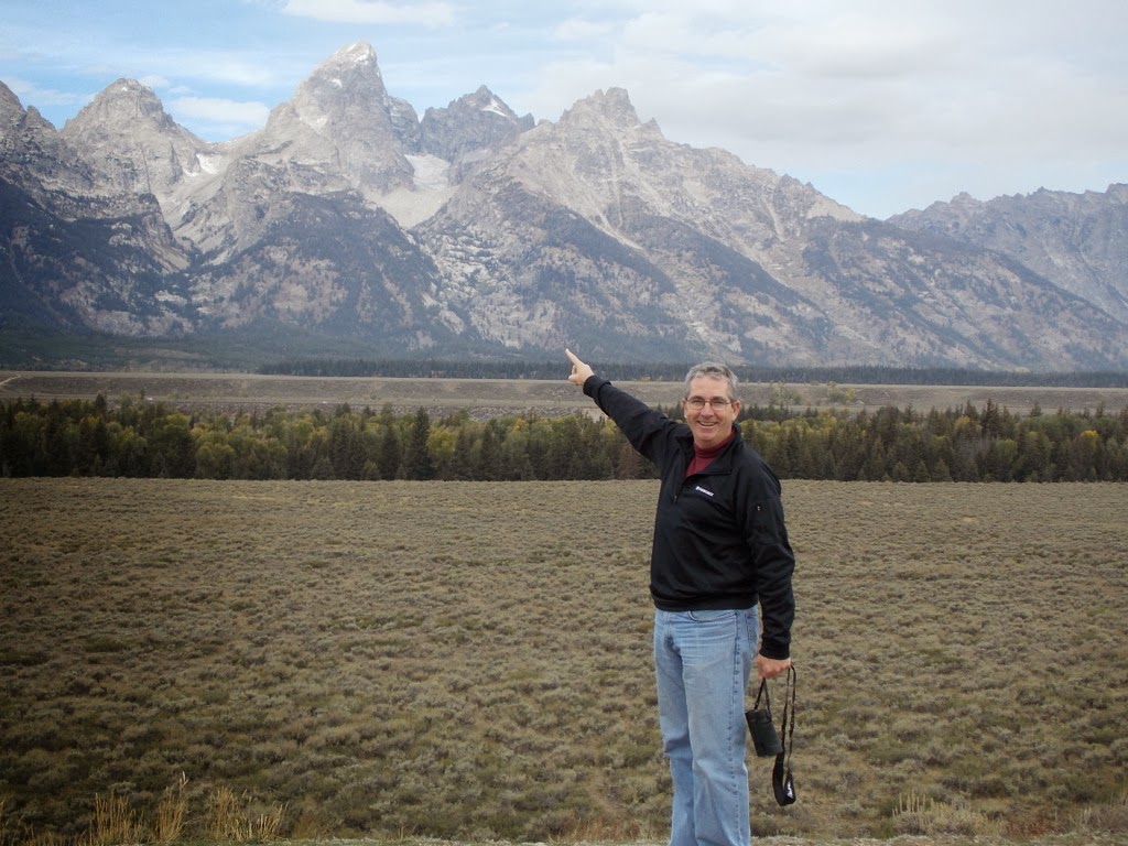 But the day was beautiful and the views were beautiful and we were enjoying the drive. Here's how the Teton Range looked from Glacier Overlook on the Snake River that morning:
