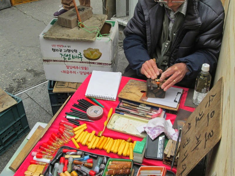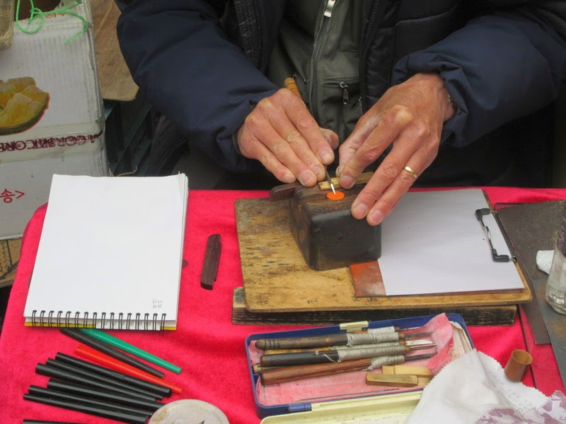 Well, I was intrigued, and after a bit of this and that, I picked out a handsome blank wooden stamp, and my friend Guenjun quickly drew some Hangul characters on a piece of paper for the man to carve.