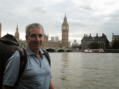 We admire the reconstructed Globe Theatre. An afternoon show is in progress, so we can't take the tour, but we are amused when we see a number of actors come running around the side of the theatre and disappear through a back door, evidently exiting "stage left" in order to re-enter "stage right".