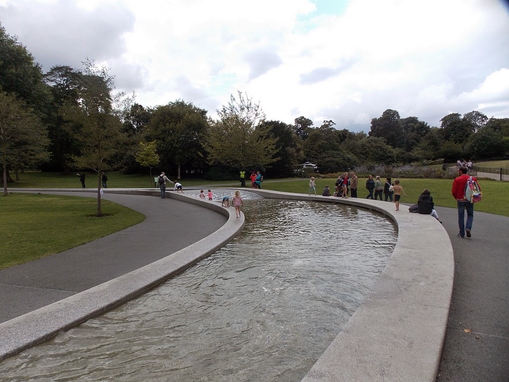 Just before we arrive at the bridge over the Serpentine, we arrive at the Lady Diana Memorial Fountain. As we near the fountain, the sun is shining and children are playing in the water.