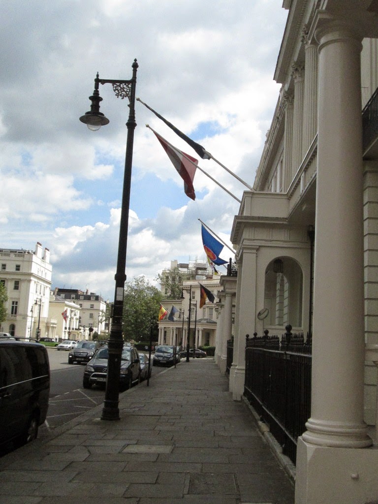 I was confused by the maps I'd read into thinking that Buckingham Palace Gardens is an open space like the other royal parks, but of course it is not, so we detour a few blocks and walk over into Belgravia, by Eaton Square and up Upper Belgrave Street.