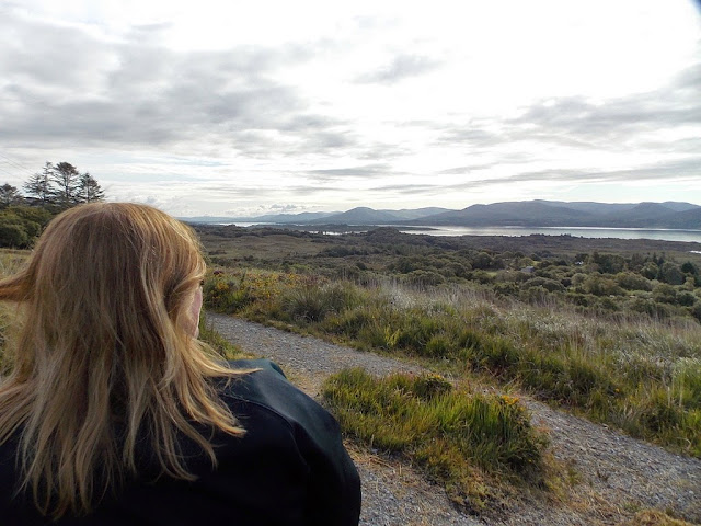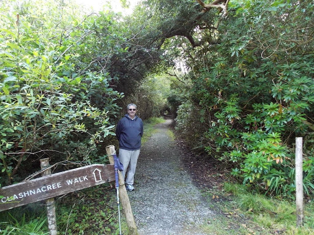 We take a nice long walk through the Parknasilla property called the Clashnachree Trail: down through the woods, past the golf course, and up to a hill with a superb view of the bay and the Beara Peninsula.