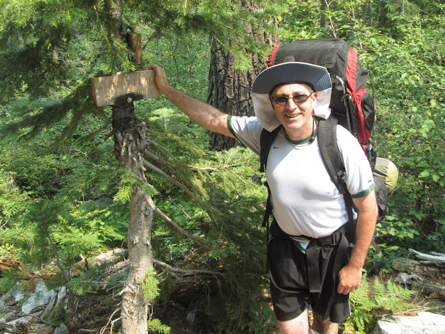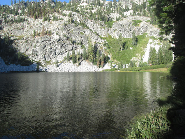 On our first afternoon at Paynes Lake we were treated to a spectacle I've never before seen in my backpacking trips: just around dusk, a bald eagle swooped down over the lake, passing barely 30 feet above the water surface. The eagle made several circuits of the lake, around and around, rising slowly until it disappeared over the ridge line, 300 feet above the lake surface. We never saw it again during our visit, but what a majestic bird that was!