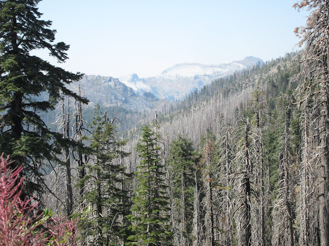 - A dense and healthy incense cedar and mountain hemlock forest in the canyon; burned trees on the other side of the Pacific Crest